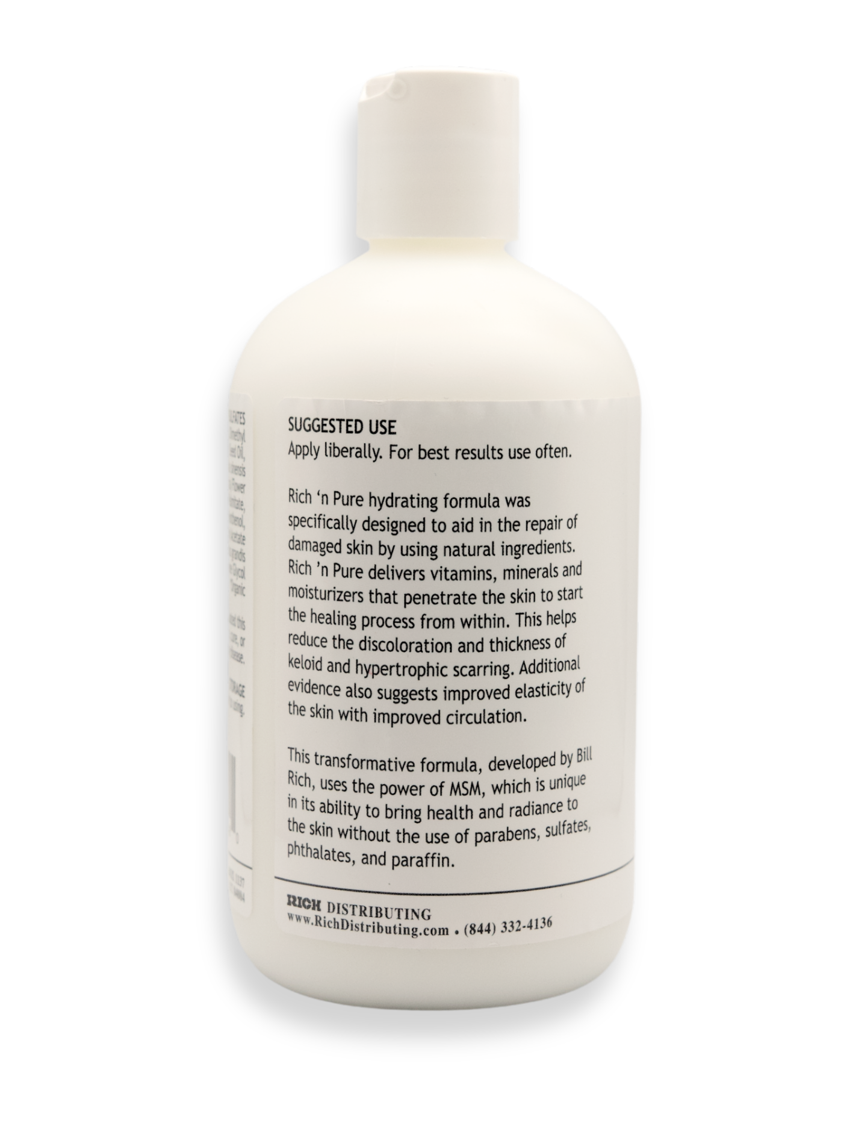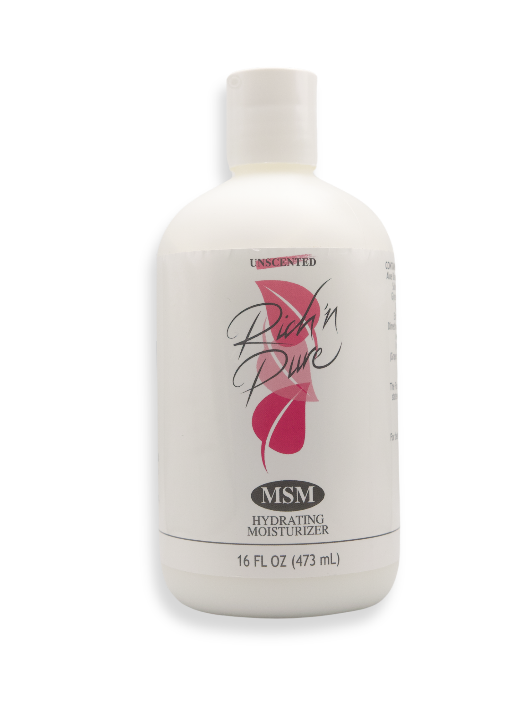 Rich’s MSM Lotion is the very first MSM lotion ever formulated. This fast-absorbing, non-greasy formula helps restore cracked, dry, and scarred skin caused by burns, abrasions, rosacea, and eczema. Designed with regenerative ingredients, this hydrating lotion supports skin repair by delivering essential vitamins, minerals, herbs, and moisturizers that penetrate deeply to promote healing from within. Studies show it improves skin elasticity and enhances circulation.