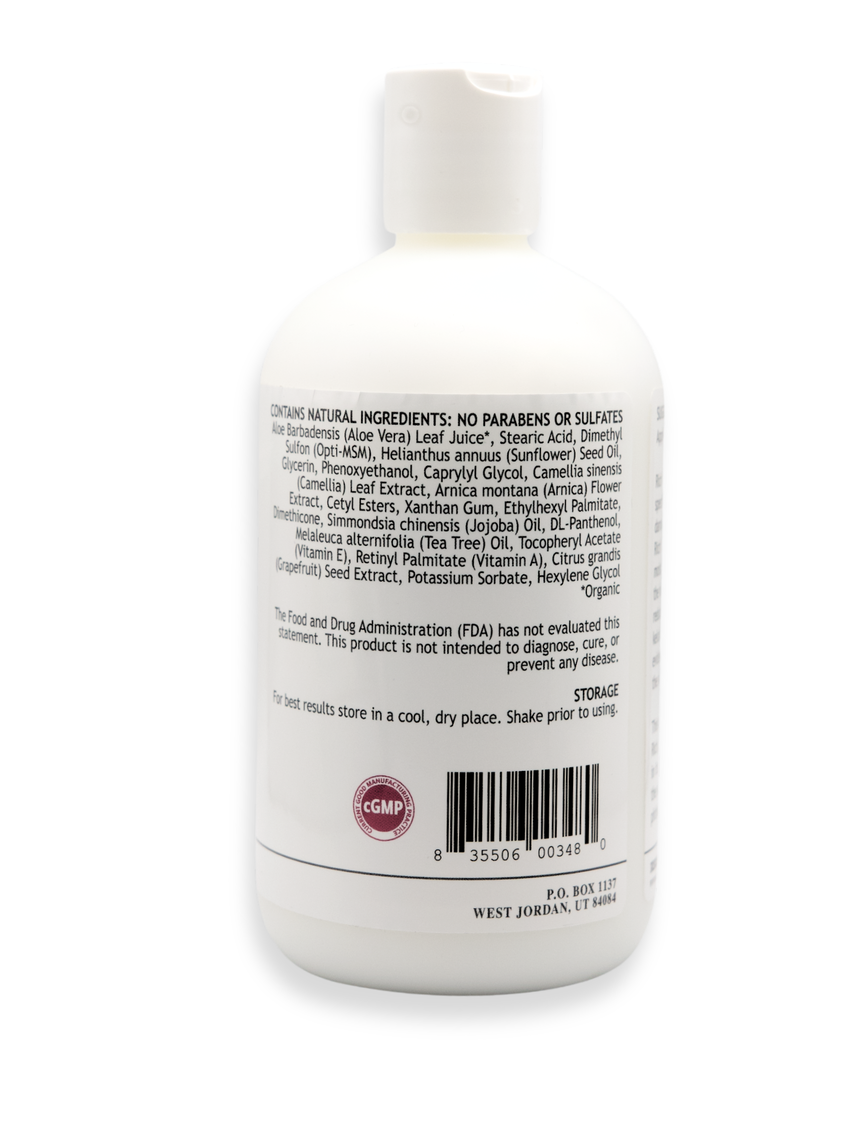 Aloe Barbadensis (Aloe Vera) Leaf Juice*, Stearic Acid, Dimethyl Sulfon (Opti-MSM), Helianthus Annuus (Sunflower) Seed Oil, Glycerin, Phenoxyethanol, Caprylyl Glycol, Camellia Sinensis (Camellia) Leaf Extract, Arnica Montana (Arnica) Flower Extract, Cetyl Esters, Xanthan Gum, Ethylhexyl Palmitate, Dimethicone, Simmondsia Chinensis (Jojoba) Oil, DL-Panthenol, Melaleuca Alternifolia (Tea Tree) Oil, Tocopheryl Acetate (Vitamin E), Retinyl Palmitate (Vitamin A), Citrus Grandis (Grapefruit) Seed Extract, Potassium Sorbate, Hexylene Glycol. *Organic - (No Parabens, Sulfates, Phthalates and Paraffin)